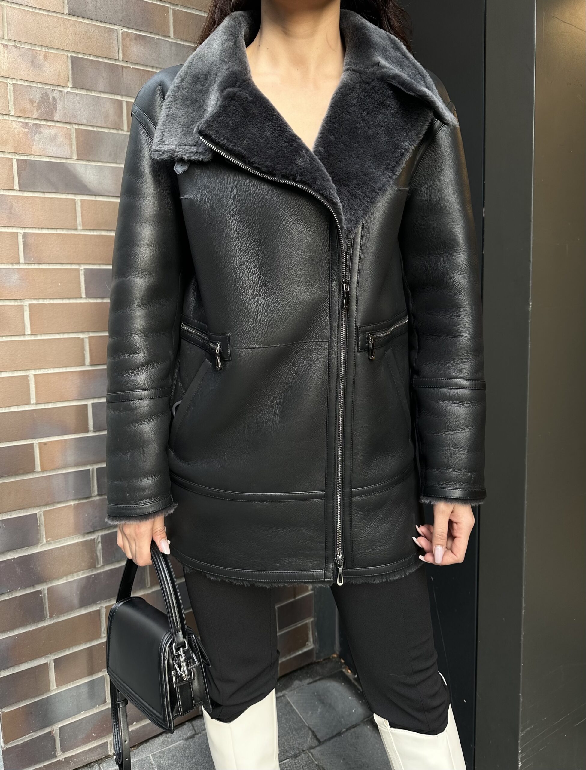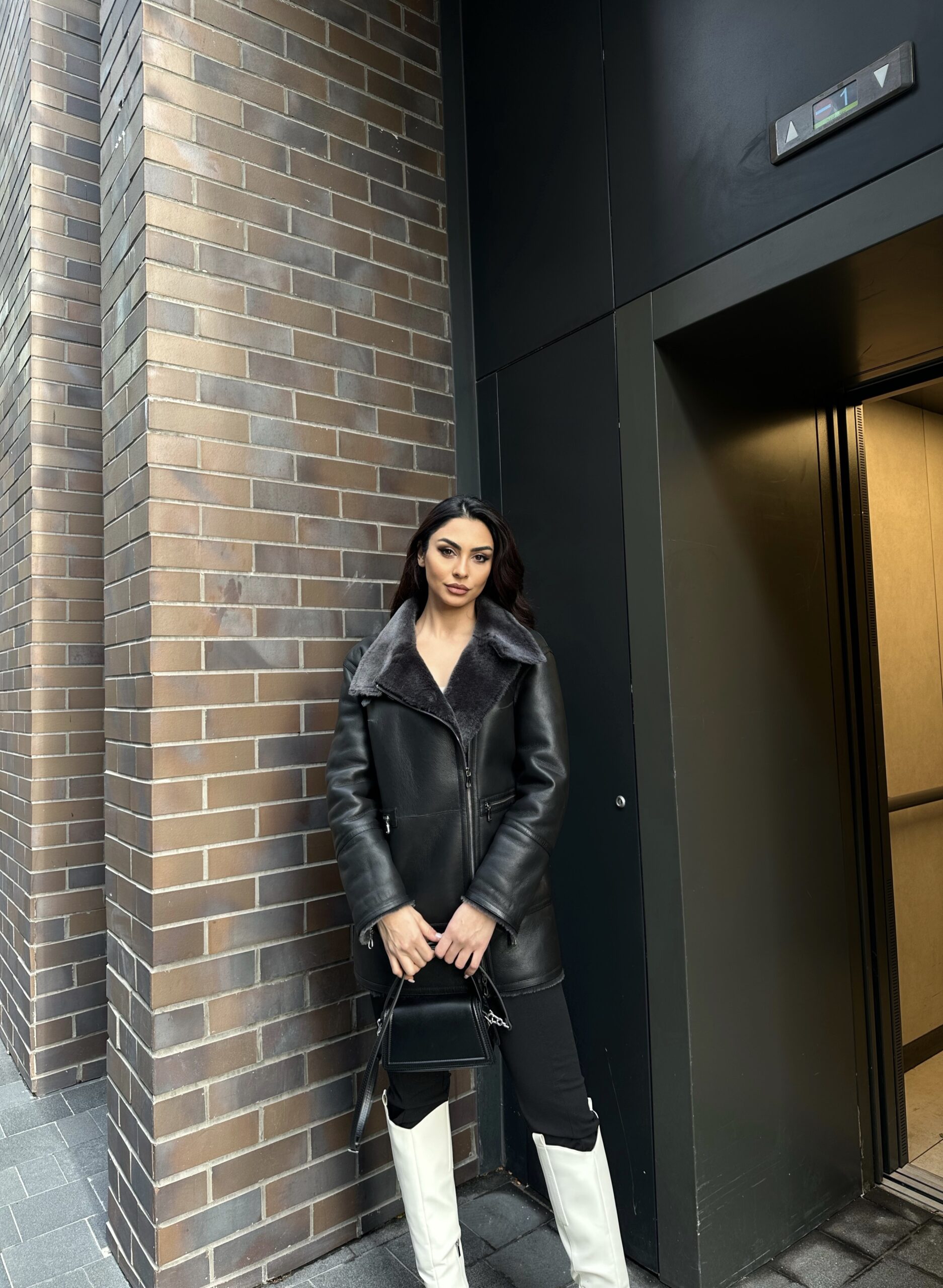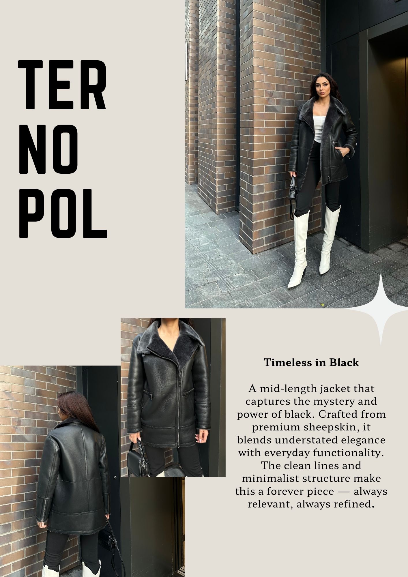 A timeless mid-length coat crafted from premium black sheepskin. Clean lines, everyday function, and forever elegance.