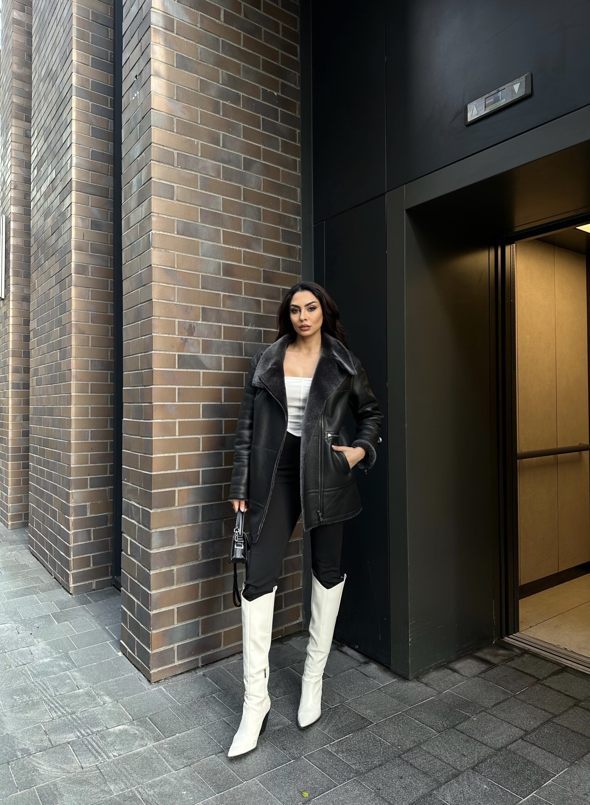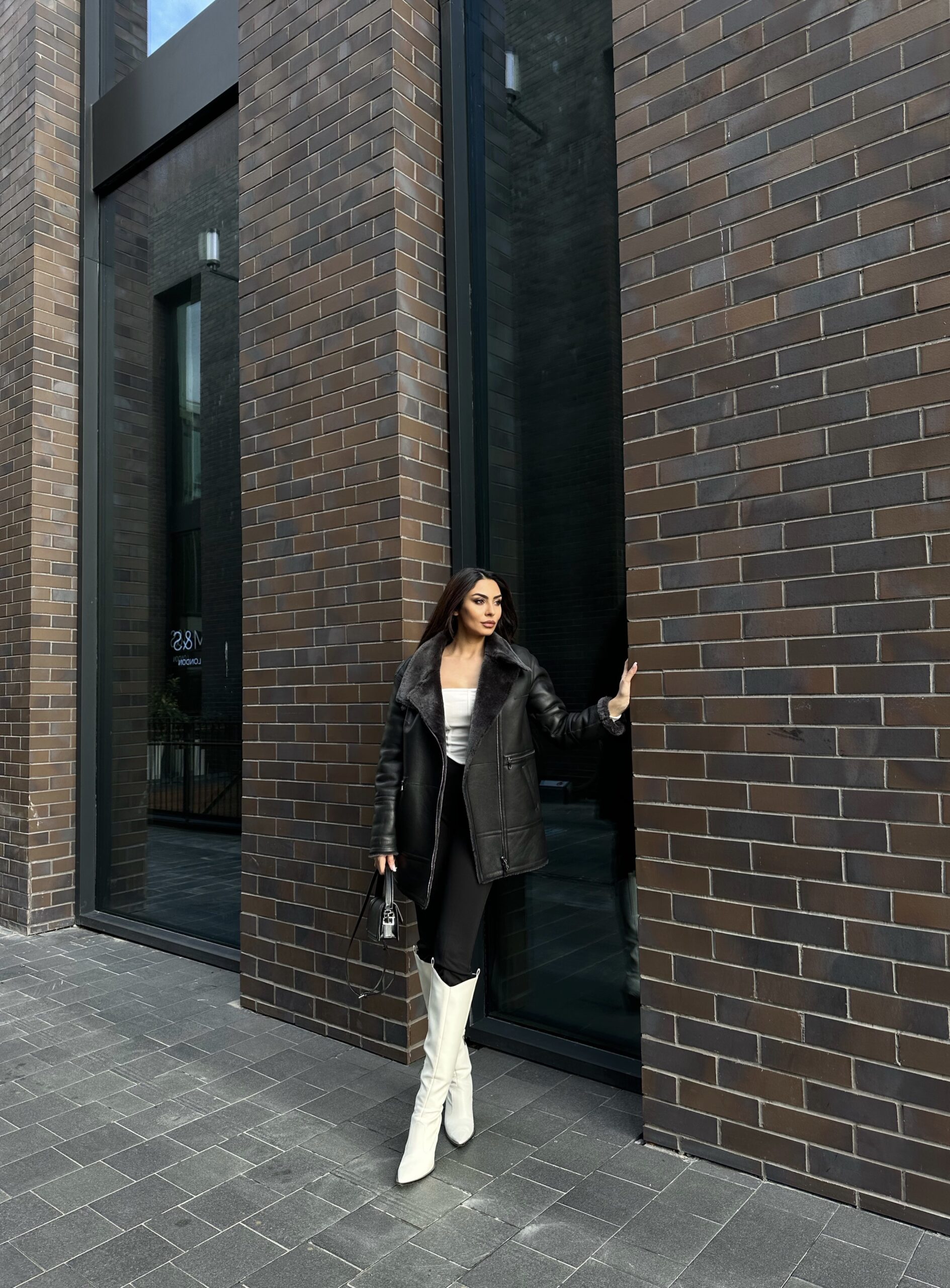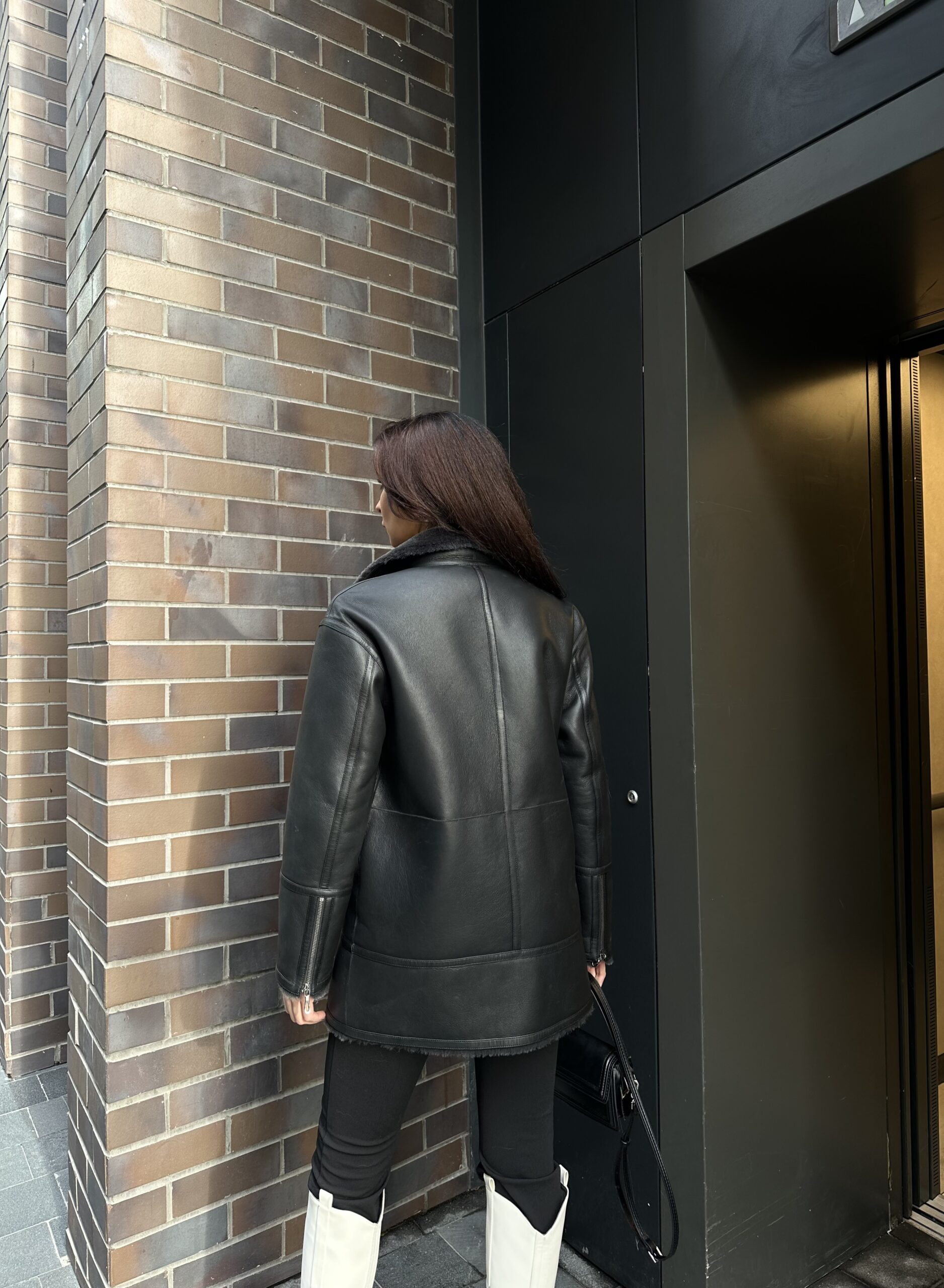A timeless mid-length coat crafted from premium black sheepskin. Clean lines, everyday function, and forever elegance.