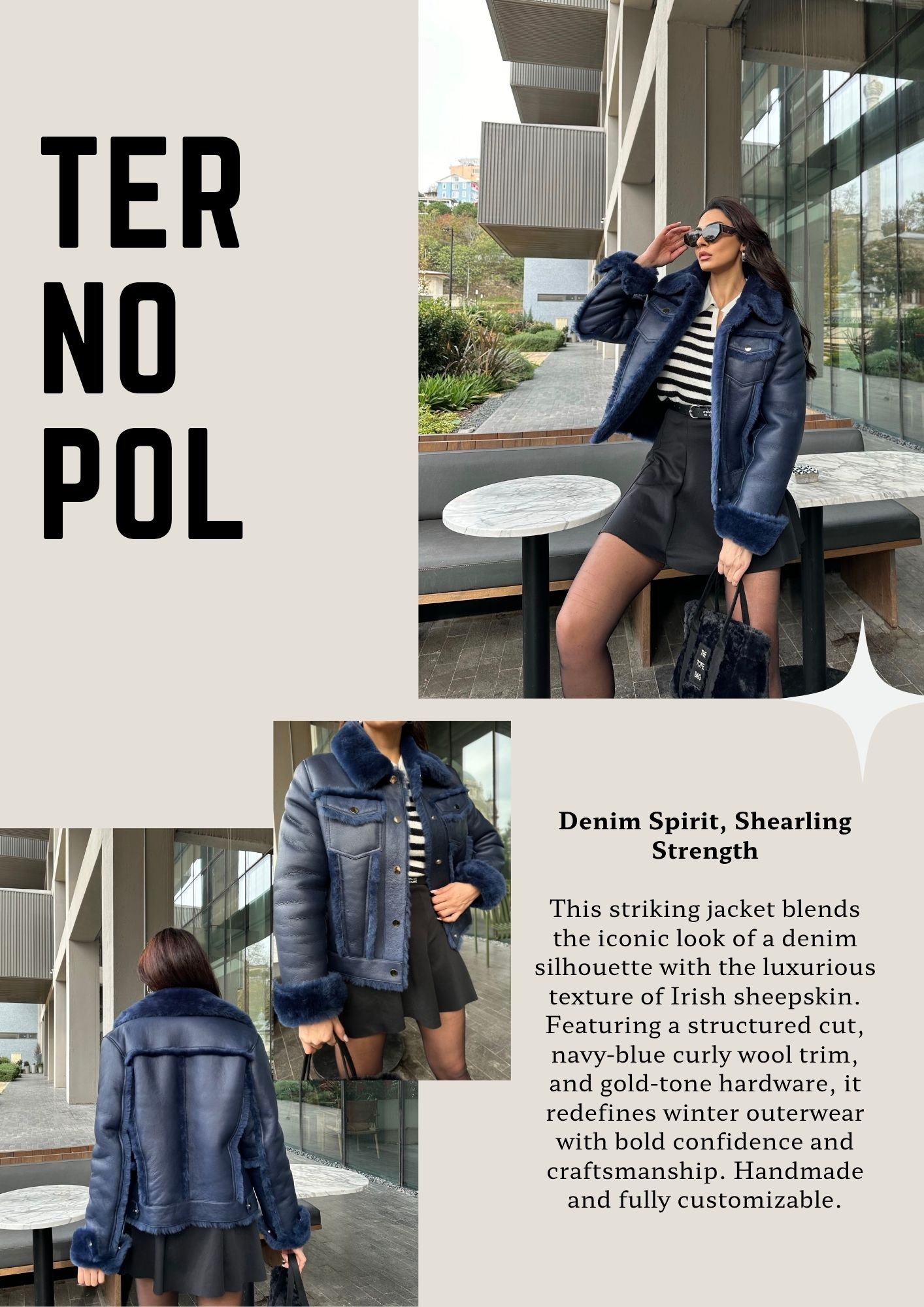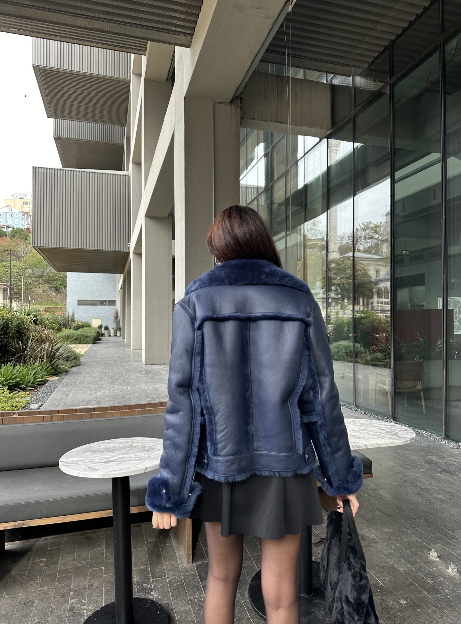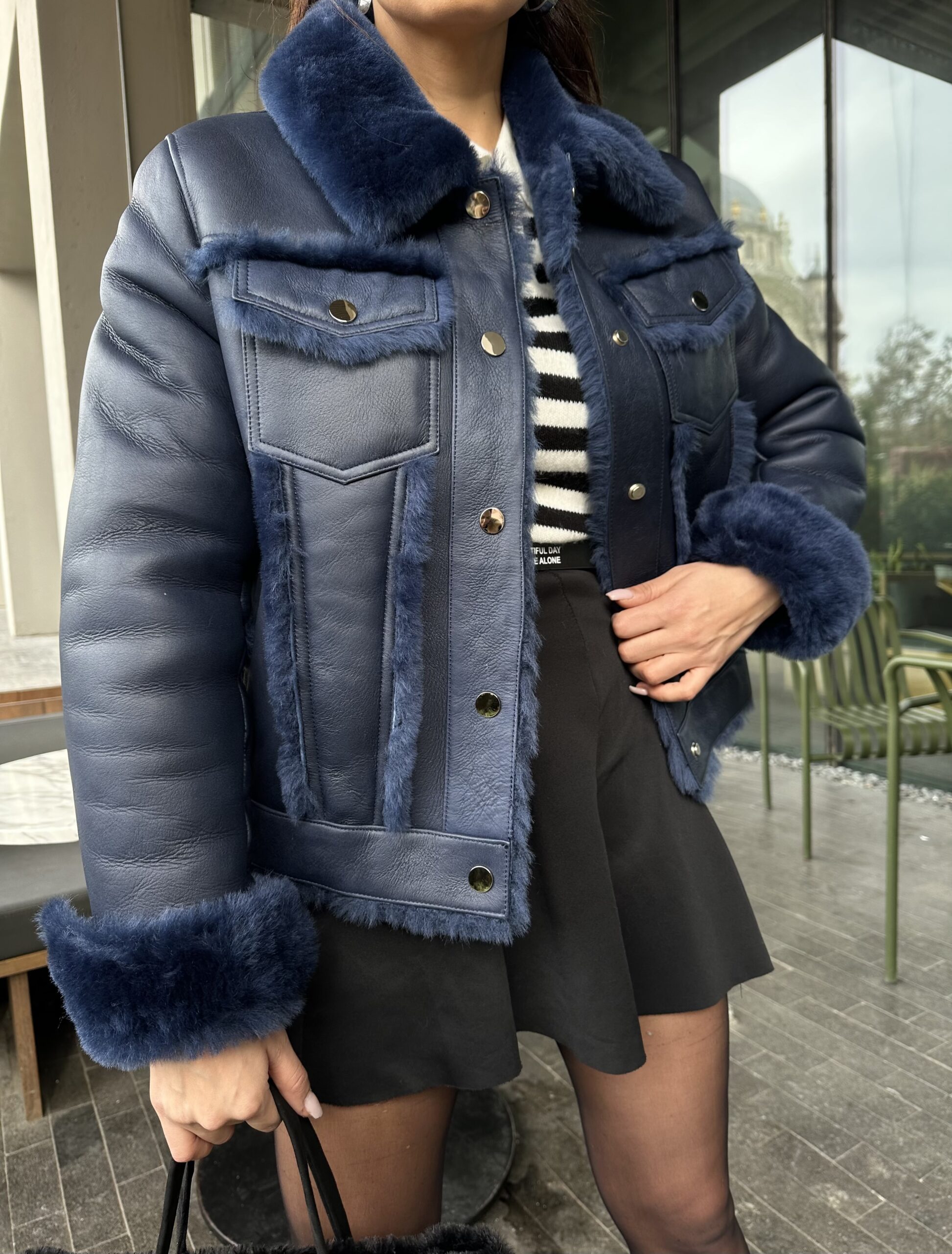 A structured navy shearling piece that blends denim attitude with luxurious warmth. Crafted to stand out.
