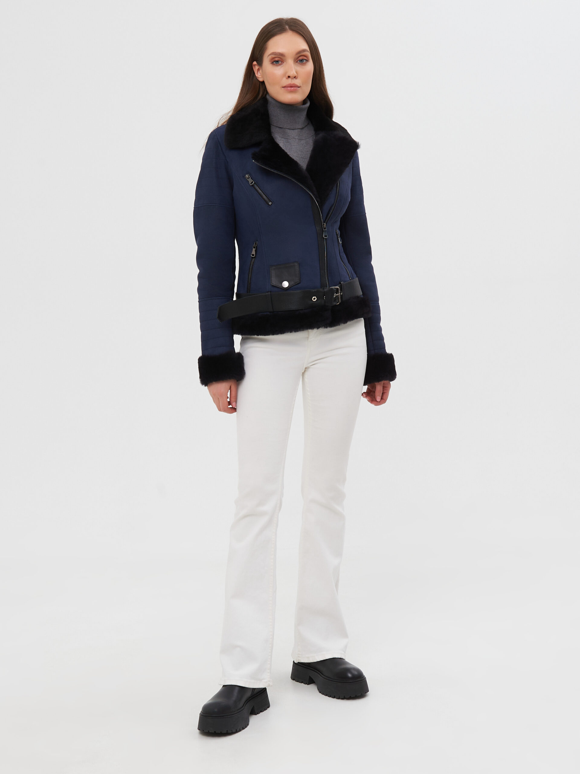 A cropped shearling biker in deep navy with black contrast. Bold, tailored, and unmistakably urban.