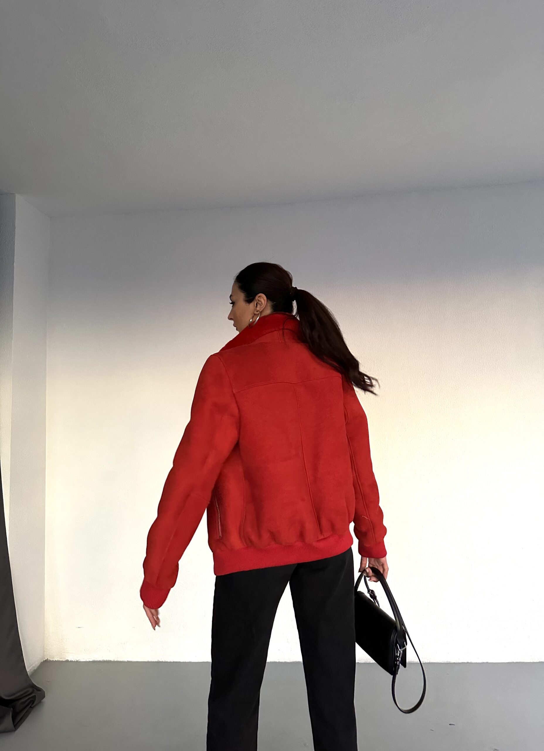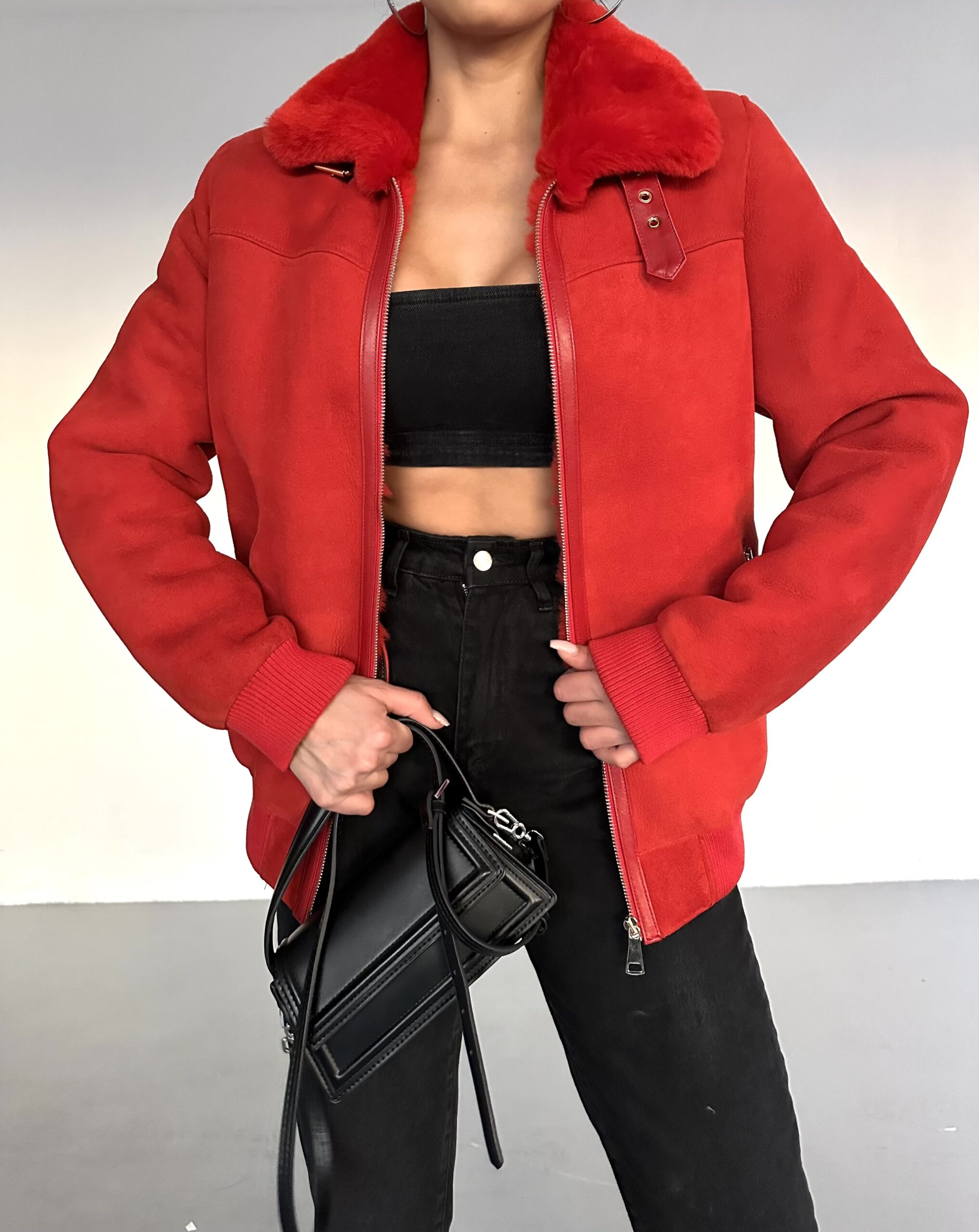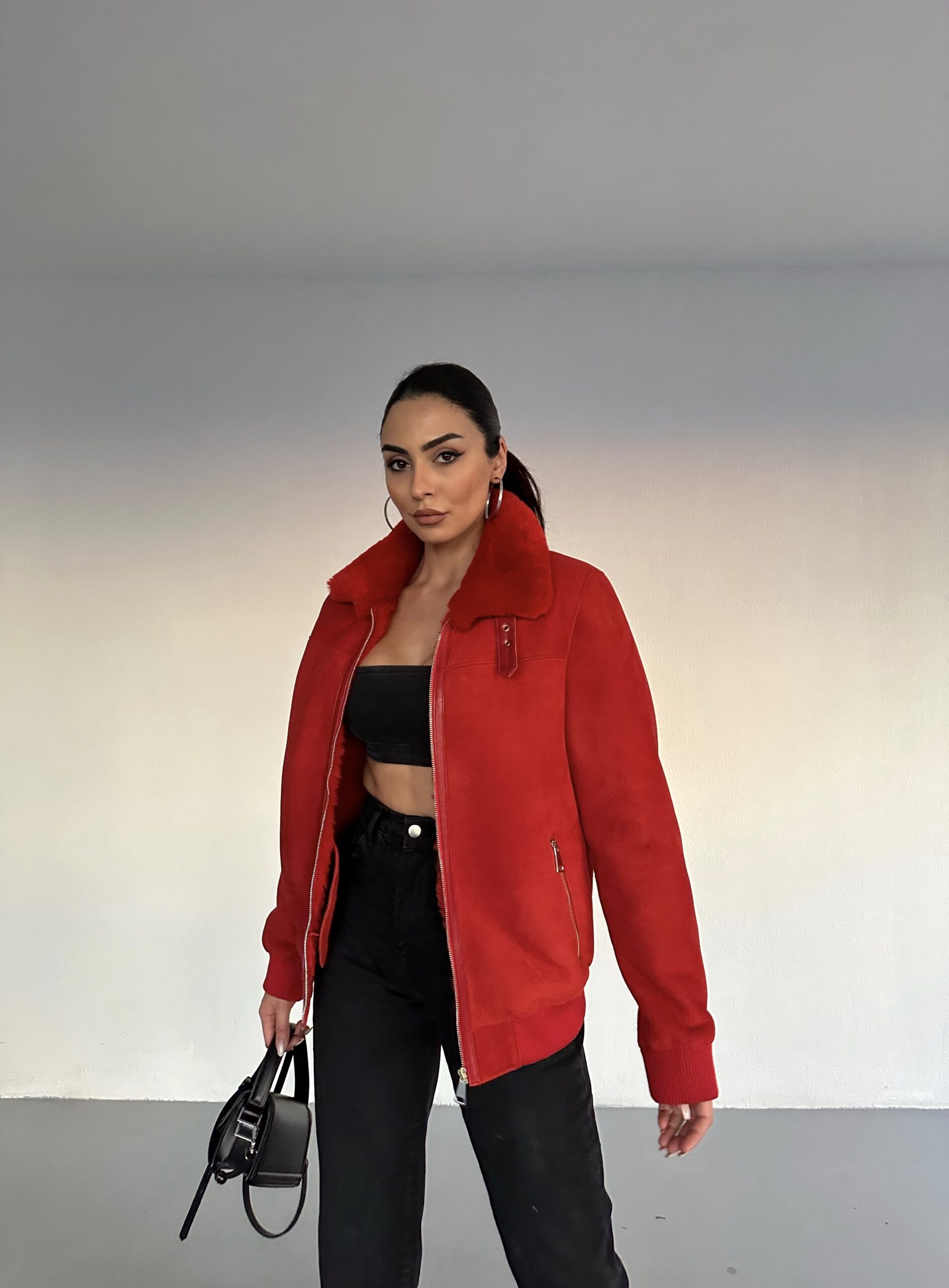 A fierce statement in rich red Irish shearling. Structured warmth, handmade to captivate.