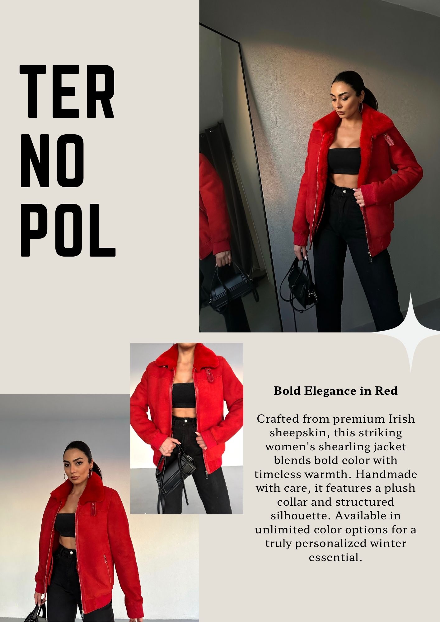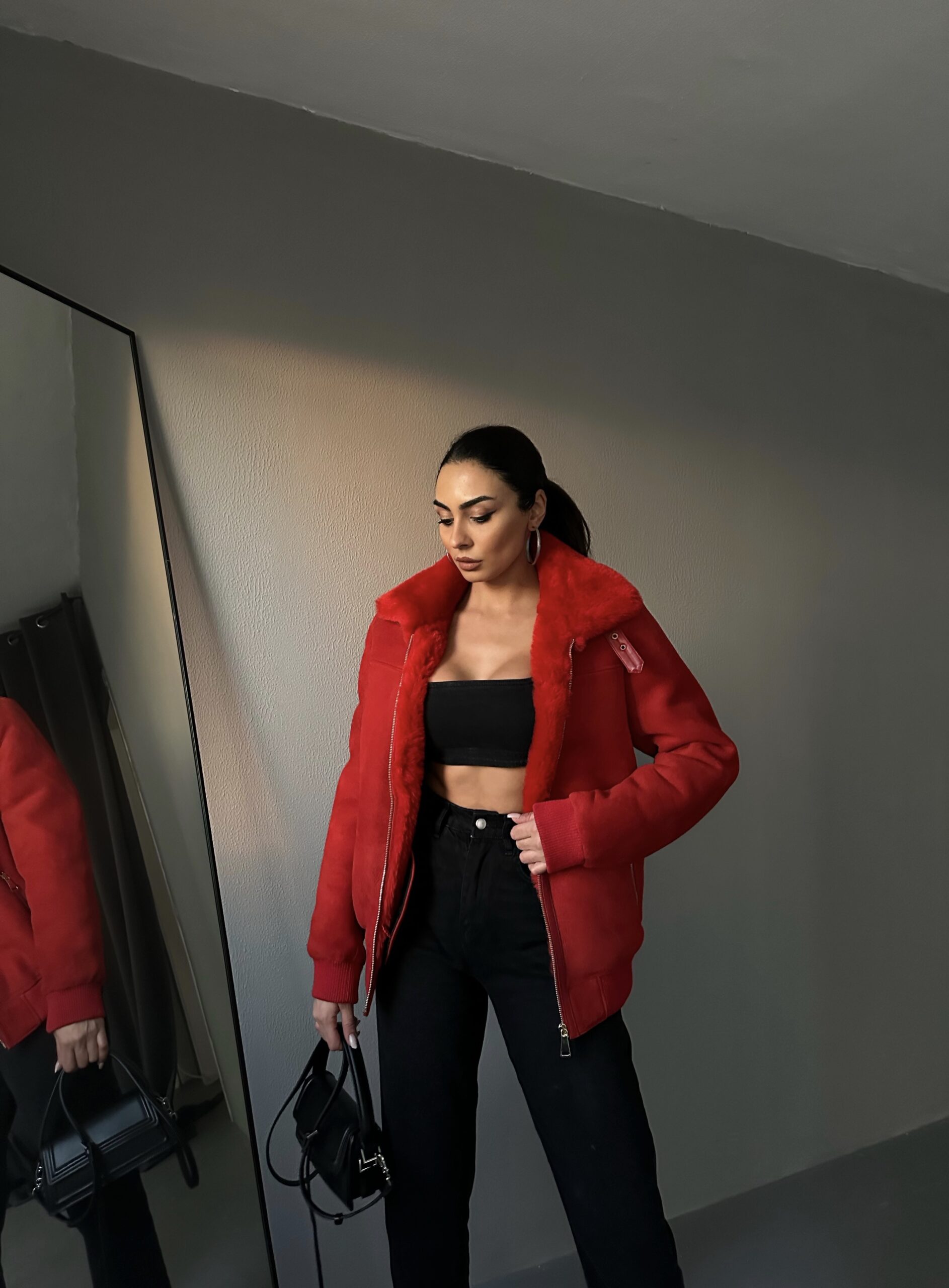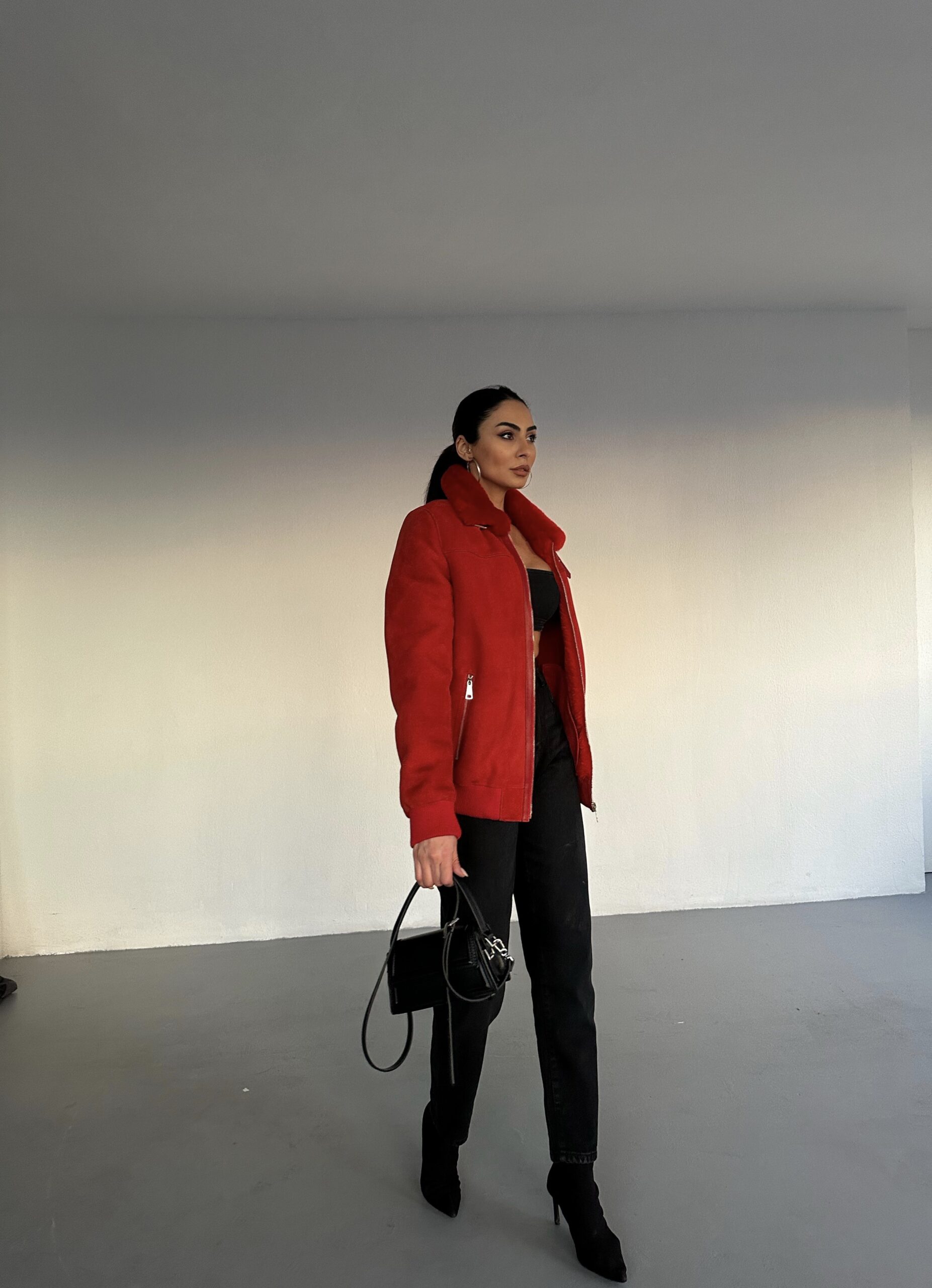 A fierce statement in rich red Irish shearling. Structured warmth, handmade to captivate.